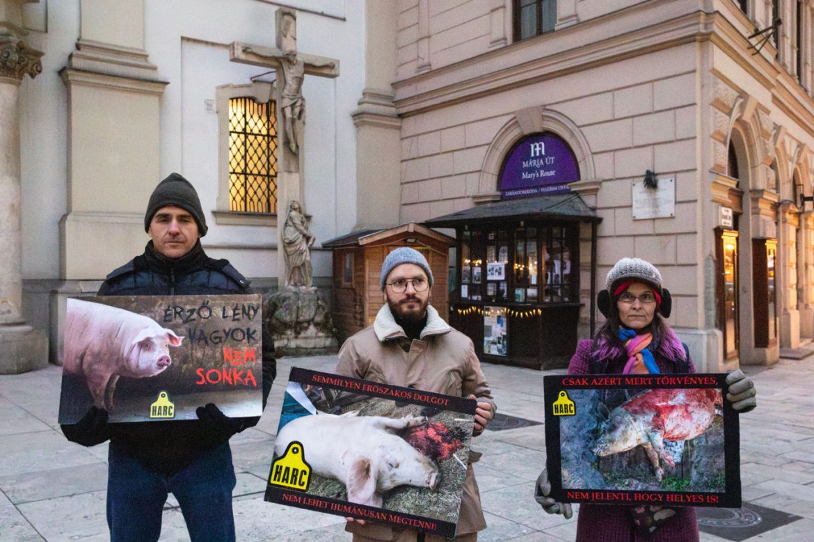 A HARC (Hungarian Animal Rights Corps) nevű vegán állatjogi aktivista csoport szokatlan és felkavaró ünnepi akciót szervezett Budapesten, a Ferenciek téri templom előtt. Vasárnap délután a csoport műállattetemekkel és véres karácsonyi díszekkel feldíszített karácsonyfát helyezett el, ezzel kívánták felhívni a figyelmet a vágóhidak működésére és a karácsony ellentmondásaira.