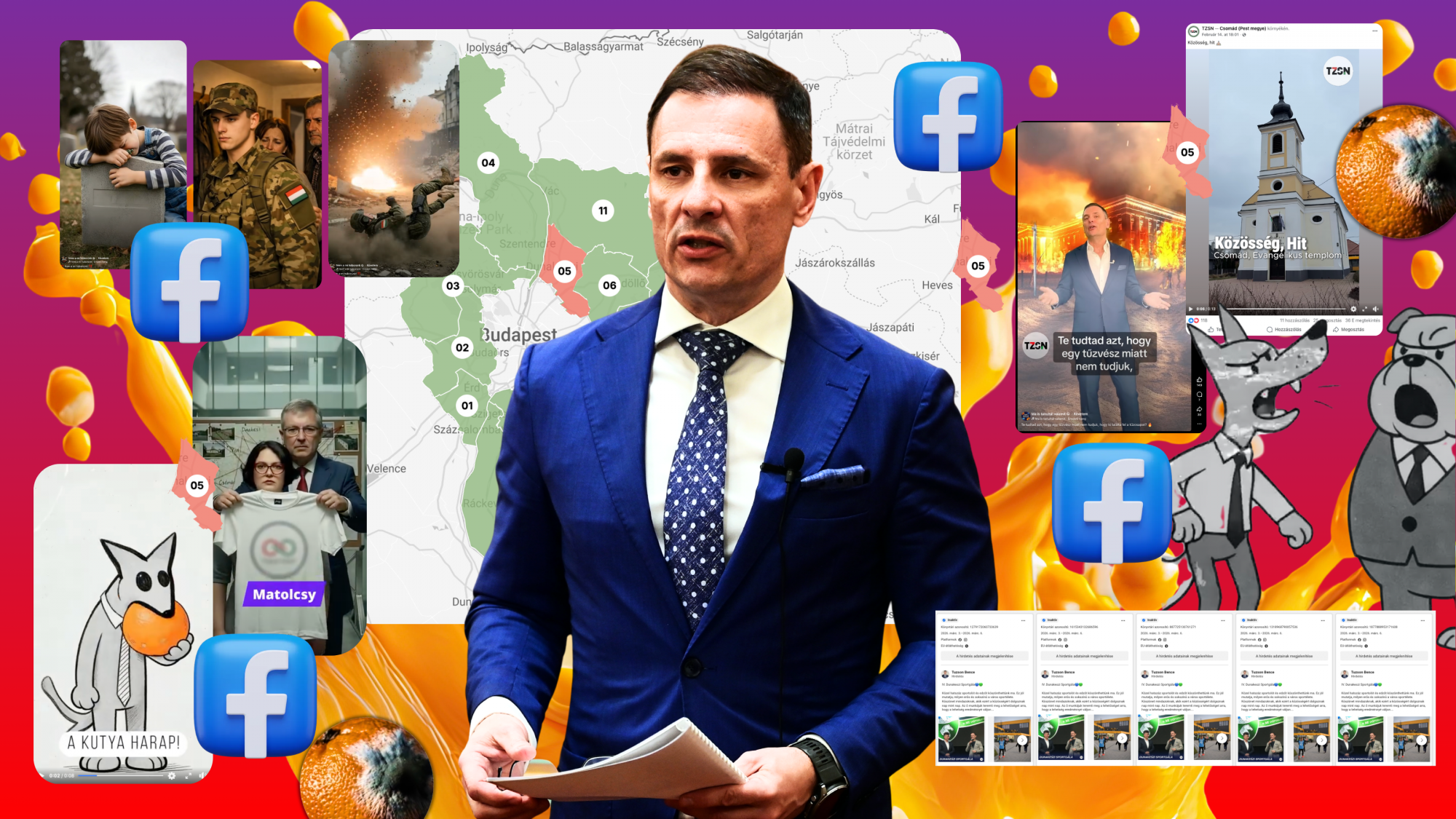A közösségi média színtere egyre inkább tele van homályos hátterű Facebook-oldalakkal, amelyek kétes hirdetésekkel próbálják népszerűsíteni a DK és az MKKP helyi jelöltjeit. Az elemzések azt sugallják, hogy ezek az oldalak nem csupán ártalmatlan kampányok, hanem szándékos dezinformáció céljából jöttek létre, hogy csökkentsék a Tisza Párt jelöltjének esélyeit. Tuzson Bence, a Fidesz képviselője, aki már 2014 óta a választókerület képviselője, saját hirdetéseivel, valamint négy másik Facebook-oldal által is támogatva igyekszik fokozni népszerűségét.