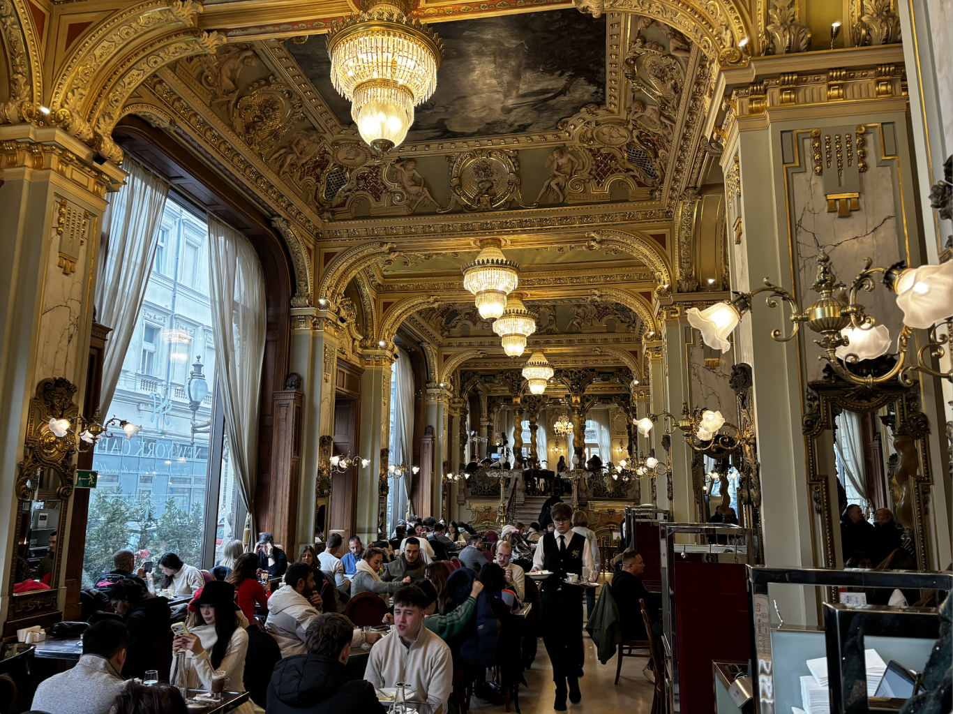 A New York Kávéház beengedőrendszere lenyűgözött bennünket: hatalmas, többsávos zsilip rendszer, pontosan úgy kialakítva, mint a legnagyobb európai múzeumoké. Itt négy-öt ember foglalkozott a beérkező vendégekkel, és mindez szinte felüdülést hozott, hiszen a szabad levegőn való várakozás már eltűnt a távolban. Ekkor derült ki, hogy a látogatás időpontja hatalmas szerepet játszik: januárban kevesebb a turisták száma, és a helyiek is inkább elkerülik ezt az időszakot. Pihenőidő volt; a konyha épp az ebéd kihívásainak előkészületeit tette.